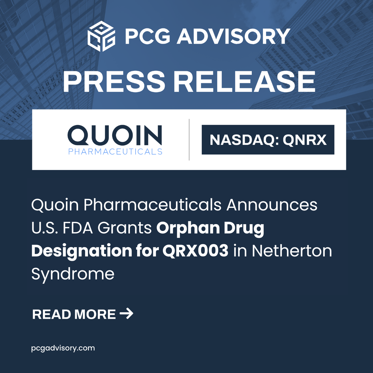 ASHBURN, Va., Oct. 21, 2025 (GLOBE NEWSWIRE) --  Quoin Pharmaceuticals Ltd. (NASDAQ: QNRX) (“Quoin” or the “Company”), a late clinical-stage specialty pharmaceutical company focused on rare and orphan diseases, today announced that the U.S. Food and Drug Administration (FDA) has granted Orphan Drug Designation (ODD) to its lead product candidate, QRX003, for the treatment of Netherton Syndrome. The designation follows previously granted Orphan Drug Designation by the European Medicines Agency (EMA) in May 2025. The FDA's Orphan Drug Designation program provides orphan status to therapies intended for the treatment, diagnosis, or prevention of rare diseases that affect fewer than 200,000 people in the United States. This designation provides certain benefits, including tax credits for qualified clinical testing, waiver or partial payment of FDA application fees and seven years of market exclusivity, if approved. QRX003 is on track to potentially become the first approved treatment for Netherton Syndrome. “Receiving Orphan Drug Designation from the FDA is yet another important milestone in our mission to bring QRX003 to patients suffering with Netherton Syndrome,” said Dr. Michael Myers, CEO of Quoin Pharmaceuticals. “Together with the EMA designation granted earlier in the year, this latest recognition by the FDA could potentially help facilitate the pathway of QRX003 to approval in the US whilst providing significant data protection to the product, if approved. Quoin remains steadfastly committed to completing the clinical development of QRX003 with a high degree of urgency on behalf of patients and families living with this devastating disease.” QRX003 lotion (4%) is being evaluated in two late-stage whole body pivotal clinical trials for Netherton Syndrome. Enrollment in both pivotal studies is expected to be completed in Q1 2026, top-line data is anticipated in the second half of 2026, and NDA submission is planned later in the year.